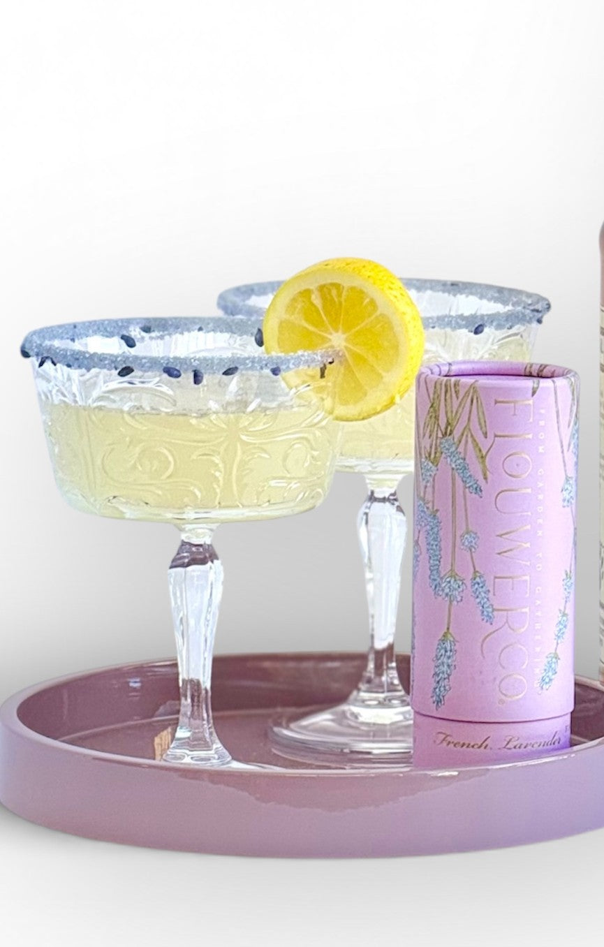 We supply these beautiful coupe glasses, rimming sugar, lavender simple syrup, and cocktail picks on our website. You can find the supplies to make this lovely drink below.